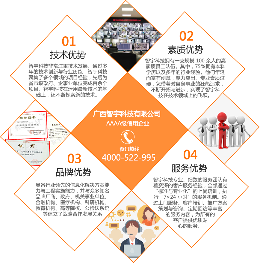 廣西智宇科技有限公司,自1995年成立以來,已發(fā)展成為一家高新技術(shù)企業(yè),擁有多家分公司,遍布南寧、桂林、玉林、河池、扶綏、百色、欽州、防城港等地。憑借30年的專業(yè)經(jīng)驗和技術(shù)儲備,智宇科技已成為一家行業(yè)領(lǐng)先的集團(tuán)企業(yè),致力于運用前沿科技產(chǎn)品和技術(shù),為客戶提供高效服務(wù)。